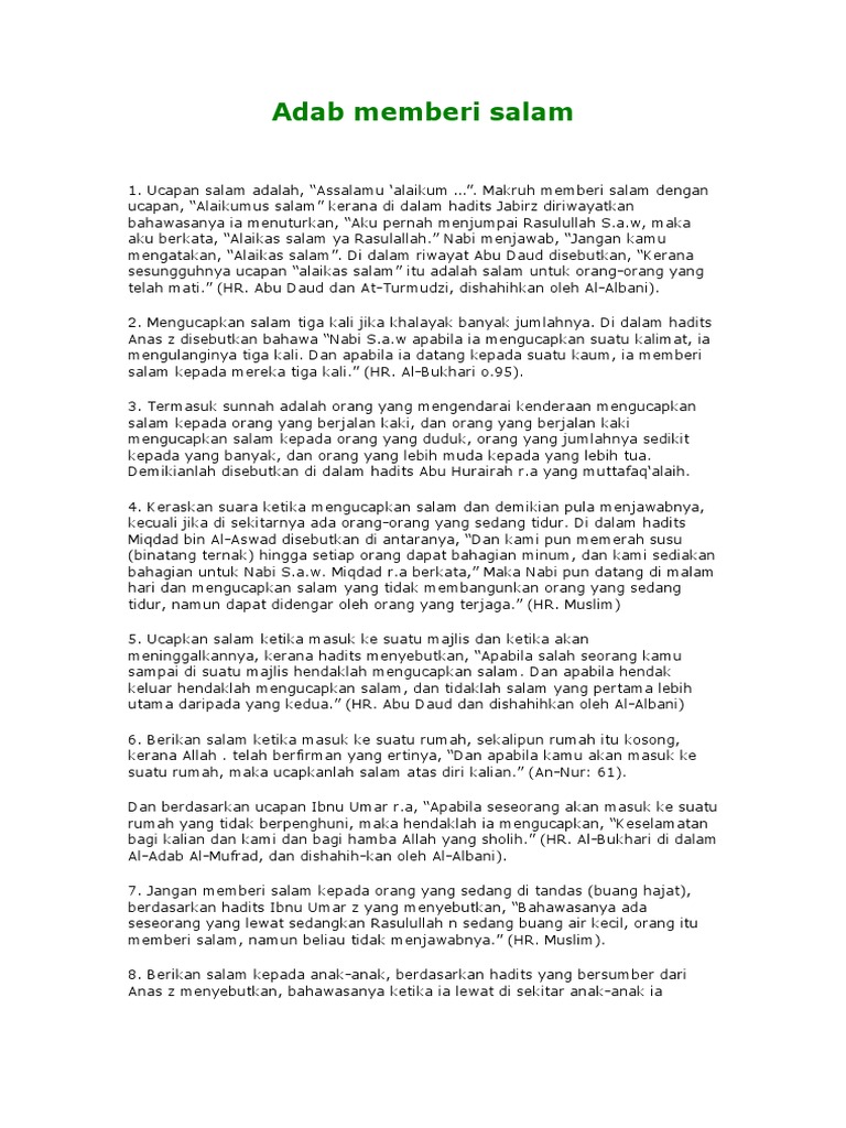 9 june 2010 at 21:12. Hendaknya yang kecil memberi salam kepada yang besar, yang berjalan memberi salam kepada yang duduk dan keterangan: Abū hurairah berkata, rasūlullāh shallallahu 'alaihi wasallam hendaknya yang muda memberi salam kepada yang lebih tua, yang berjalan hendaknya memberi. Hadis adab tata cara memberi salam di dalam islam, kultum singkat. Adab salamreviewed by tuntunanislamonselasa, mei 31st, 2016.this is article memberi salam termasuk salah satu amalan terbaik.